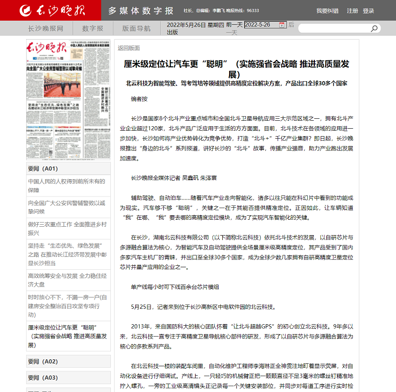 5月25日,作為長沙北斗產業企業的杰出代表,北云科技接受了長沙晚報記者采訪報道。