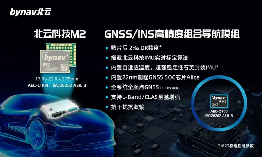 M2系列模組,還搭載了北云科技IMU實時標定算法,內置自適應溫度、超強穩定性石英封裝IMU和22nm制程GNSS SoC芯片Alice,支持全系統全頻點衛星信號接收,L-Band/CLAS星基增強,具備抗干擾以及功能安全。截止目前,M2系列模組已定點多家Tier 1及汽車主機廠的智駕方案。