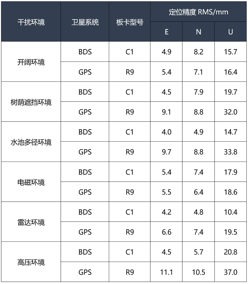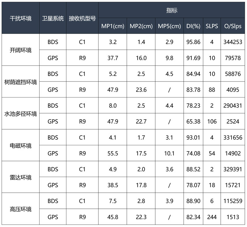 在開闊環境下,BDS信號和GPS信號性能相當。在樹蔭遮擋、水池多徑和各類干擾環境下,BDS的定位精度都明顯高于GPS,信號質量指標(抗多徑能力、信號穩定跟蹤和周跳探測與修復的能力)整體優于GPS。