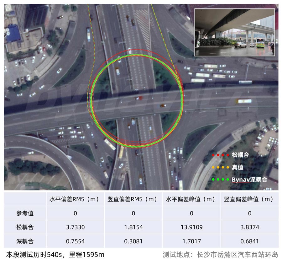 實測顯示在高架環島等惡劣環境下,深耦合定位相較于松耦合定位,誤差減小3-7倍。