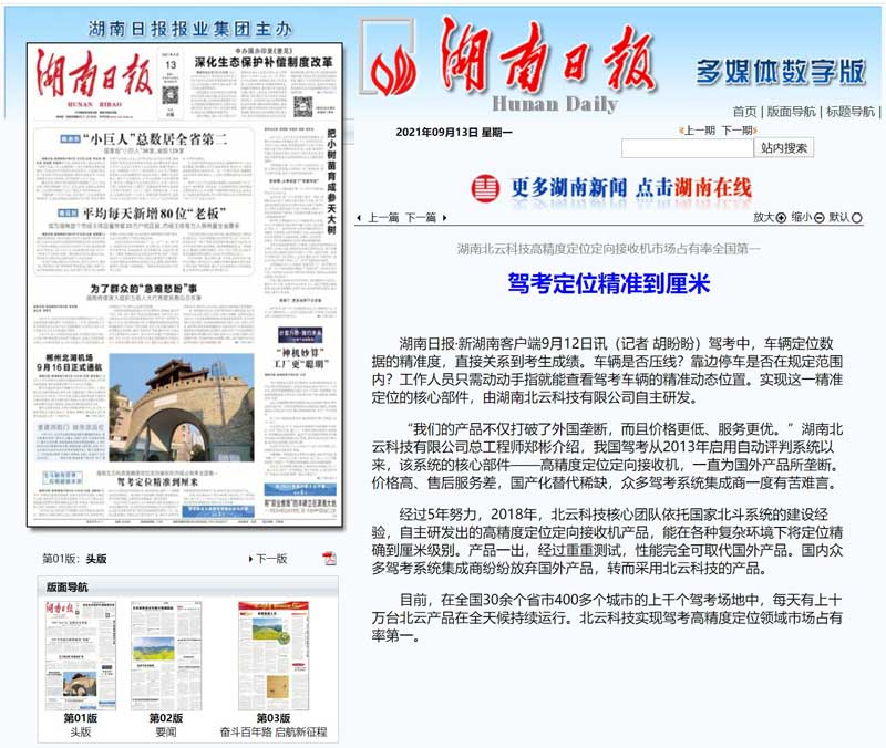 在車載高精度定位細分領域,湖南北云科技有限公司可為駕考系統提供可信的厘米級定位,已經為湖南湘江新區自動駕駛測試場提供了覆蓋全區的北斗地基增強系統,促進北斗智能可信導航、智能網聯汽車、地理信息與5G等技術的應用融合在全國率先示范。