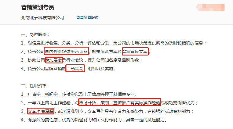 以上是一個營銷策劃的崗位,里面的關鍵詞很明顯:新媒體運營、文案策劃、展會活動;如果你簡歷上寫上“會編程……”,那可能已經直接被hr小姐姐們給pass掉了。