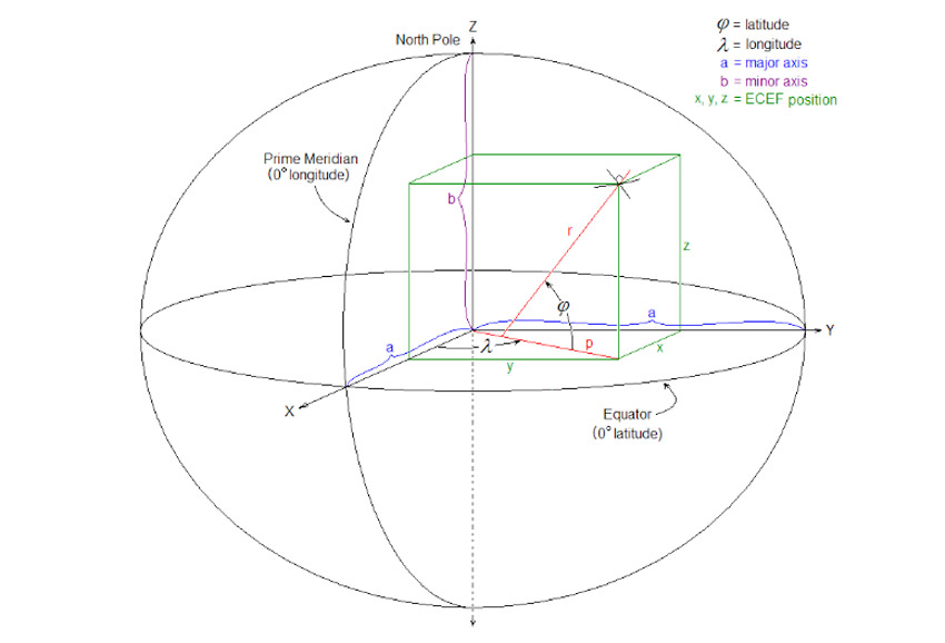 站心坐標系也叫東北天坐標系ENU,用于表示以觀察者為中心的其他物體的運動規律。以站心為坐標系原點,z軸與橢球法線重合,向上為正,y與橢球短半軸重合(北向),x軸與橢球長半軸重合(東向)。