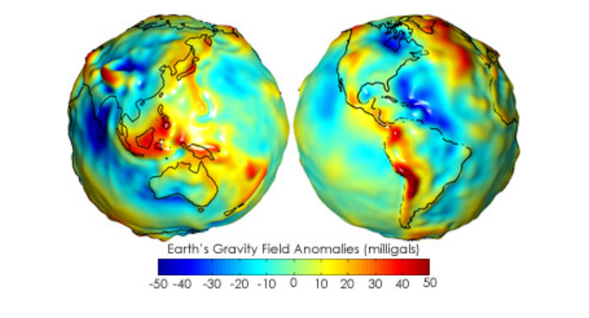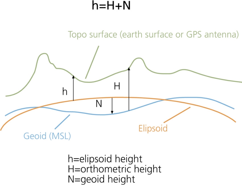 如圖3-2所示,橙色曲線為參考橢球面,綠色曲線為地表(或GPS天線位置),h為橢球高,GPS定位解算結果(ECEF)在WGS84橢球下可轉換為經緯度和橢球高h。藍色曲線為大地水準面Geoid,對應于最小二乘下的全球平均海平面(Mean Sea Level),恒重力勢平面,由于地球密度分布不均,各地的重力勢存在差異,因而大地水準面不是規則的曲面(圖33)。相對于大地水準面的高度H稱為海拔高(orthometric height),或者平均海平面高(MSL)。大地水準面的高度N是大地水準面相對于橢球面的高度,也稱高程異常。橢球高h、海拔高H和高程異常N三者之間的關系為h=H+N。