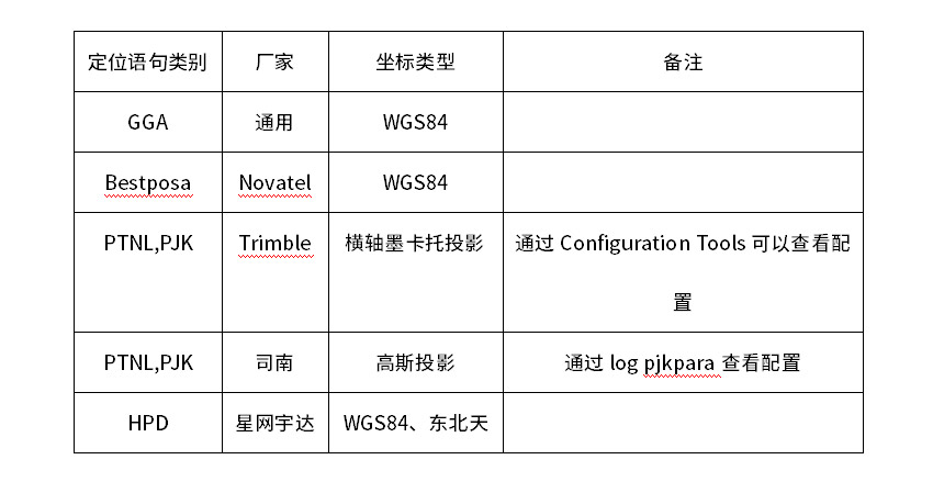 接收機中輸出的Bestposa或者GGA語句中包含為WGS84坐標系下的經緯度、海拔高及高程異常。輸出WGS84坐標系下經緯度的為通用格式,所有廠家兼容,在同一點定位結果一致。需要注意的是GGA中經緯度為度分,Bestposa和HPD中經緯度單位為度。