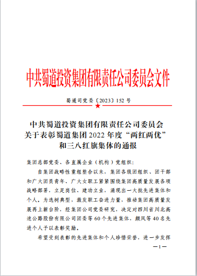 為選樹(shù)典型,激發(fā)職工奮進(jìn)力量,推動(dòng)蜀道集團(tuán)高質(zhì)量發(fā)展再上新臺(tái)階,4月17日,蜀道集團(tuán)黨委印發(fā)《關(guān)于表彰蜀道集團(tuán)2022年度“兩紅兩優(yōu)”和三八紅旗集體的通報(bào)》,敘古公司機(jī)關(guān)團(tuán)支部榮獲榮獲五四紅旗團(tuán)支部稱號(hào)。