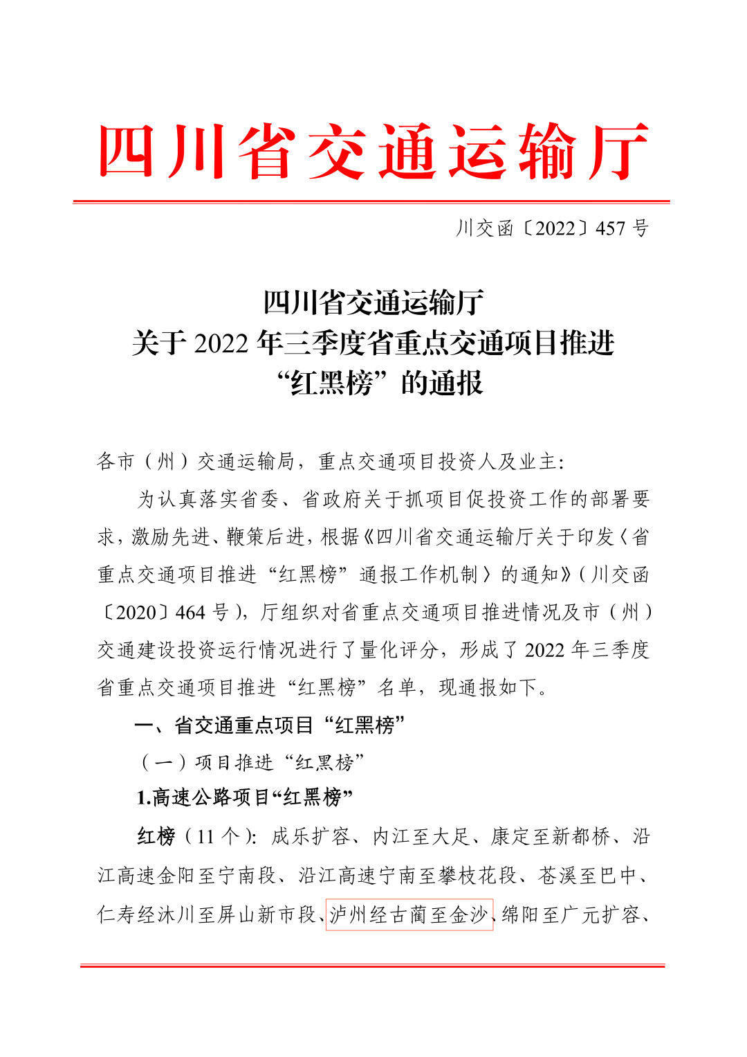10月19日,四川省交通運輸廳發(fā)布《關于2022年三季度省重點交通項目推進“紅黑榜”的通報》(川交函〔2022〕457號),川黔公司投建的古金高速榮登省交通重點項目中高速公路項目推進“紅榜”。