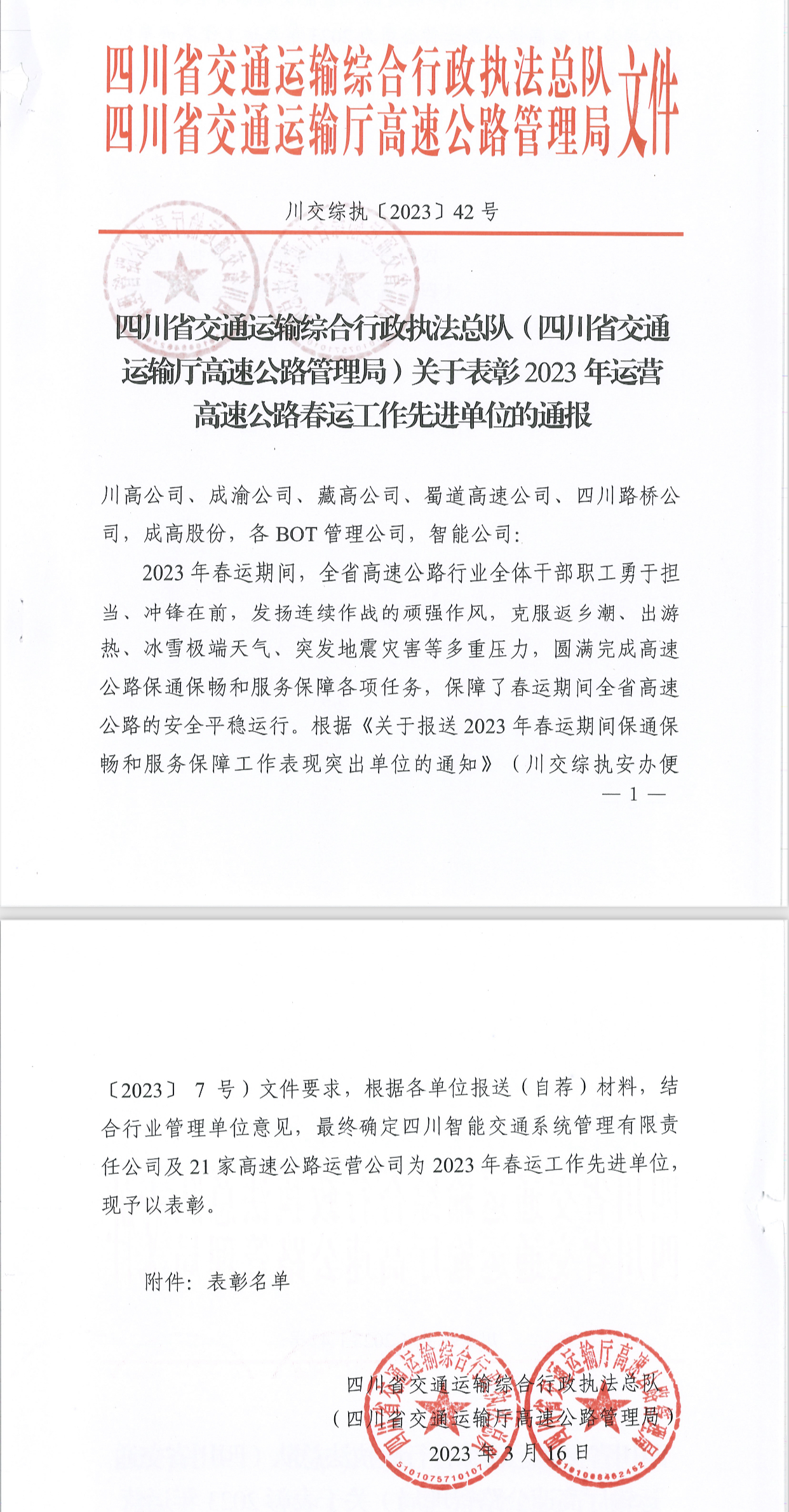 3月16日,四川省交通運(yùn)輸綜合執(zhí)法總隊(duì)(四川省交通運(yùn)輸廳高速公路管理局)印發(fā)《關(guān)于表彰2023年運(yùn)營高速公路春運(yùn)工作先進(jìn)單位的通報(bào)》,敘古公司榮獲春運(yùn)工作先進(jìn)單位榮譽(yù)稱號(hào)。