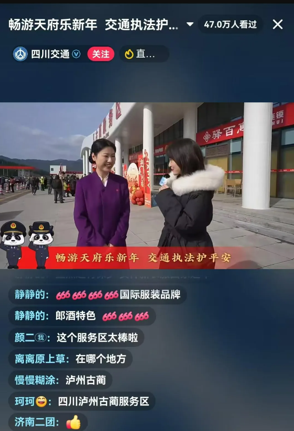 1月26日14:30,在“四川交通”抖音號直播間,大家跟隨鏡頭走進了G7512筑蓉高速(古金段)古藺服務區(qū)。春運春節(jié)期間,瀘渝公司圍繞高速公路便捷出行、保通保暢、優(yōu)質服務、安全生產等重點任務,致力打造“便捷春運、順暢春運、溫馨春運、安康春運”,全力做好公眾出行服務保障,為乘客提供優(yōu)質服務,展現(xiàn)瀘渝公司的良好形象。