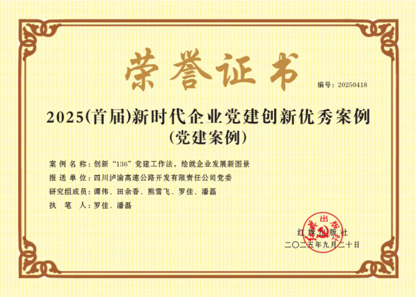 9月20日,由紅旗出版社主辦的2025(首屆)新時代企業(yè)黨建經(jīng)驗交流會暨企業(yè)黨建創(chuàng)新優(yōu)秀案例發(fā)布儀式在北京舉行。瀘渝公司黨建案例《創(chuàng)新“136”黨建工作法,繪就企業(yè)發(fā)展新圖景》從1400余個申報案例中脫穎而出,獲評2025(首屆)新時代企業(yè)黨建創(chuàng)新優(yōu)秀案例。