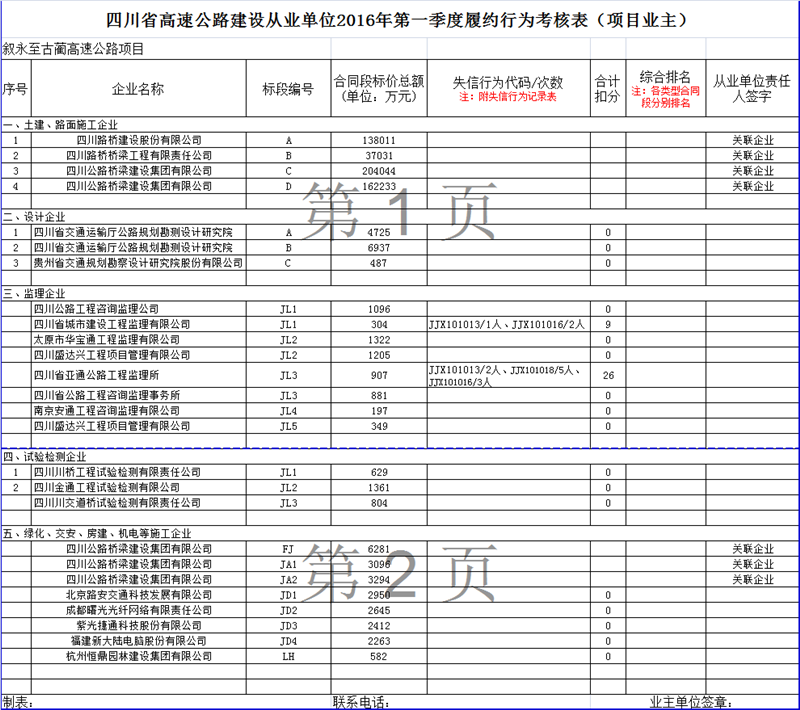 四川省高速公路建設(shè)從業(yè)單位2016年第一季度履約行為考核表