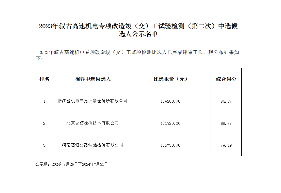 2023年敘古高速機(jī)電專項改造竣(交)工試驗檢測(第二次)中選候選人公示名單