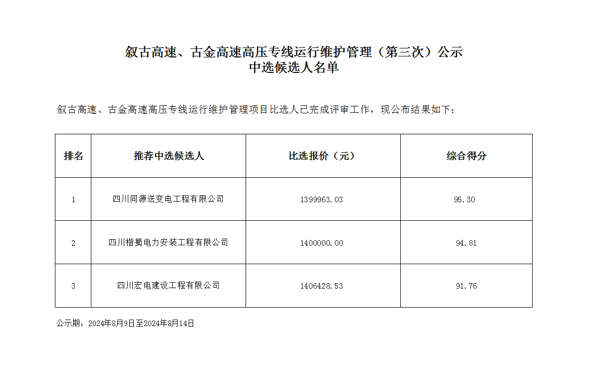 敘古高速、古金高速高壓專線運(yùn)行維護(hù)管理(第三次)公示中選候選人名單
