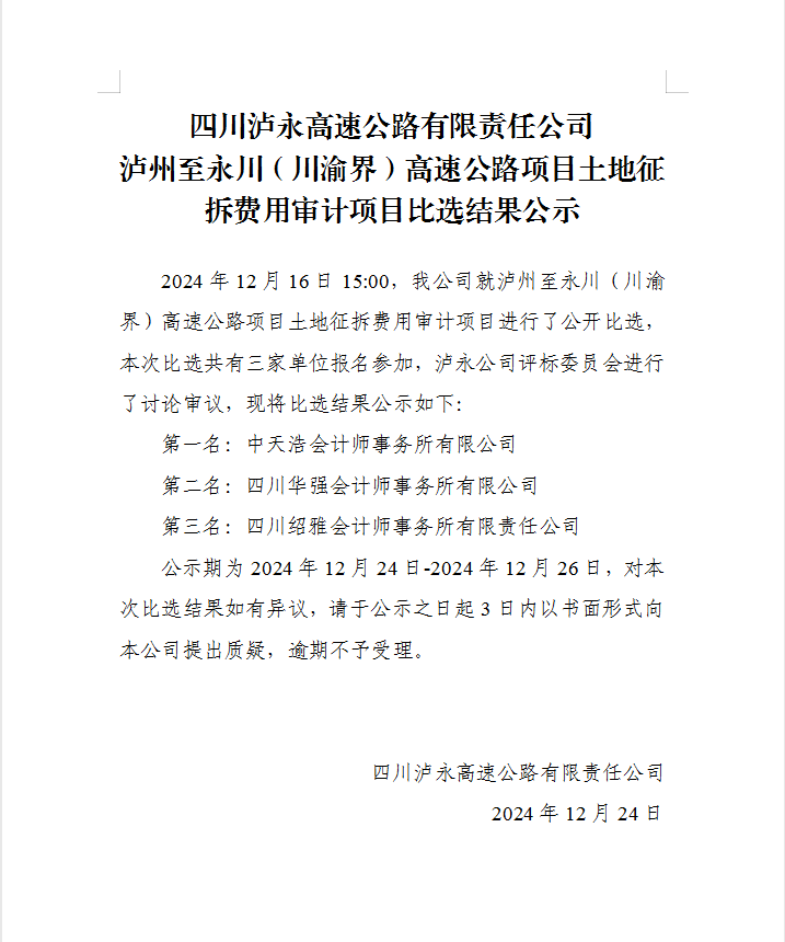 四川瀘永高速公路有限責(zé)任公司瀘州至永川(川渝界)高速公路項(xiàng)目土地征拆費(fèi)用審計(jì)項(xiàng)目比選結(jié)果公示