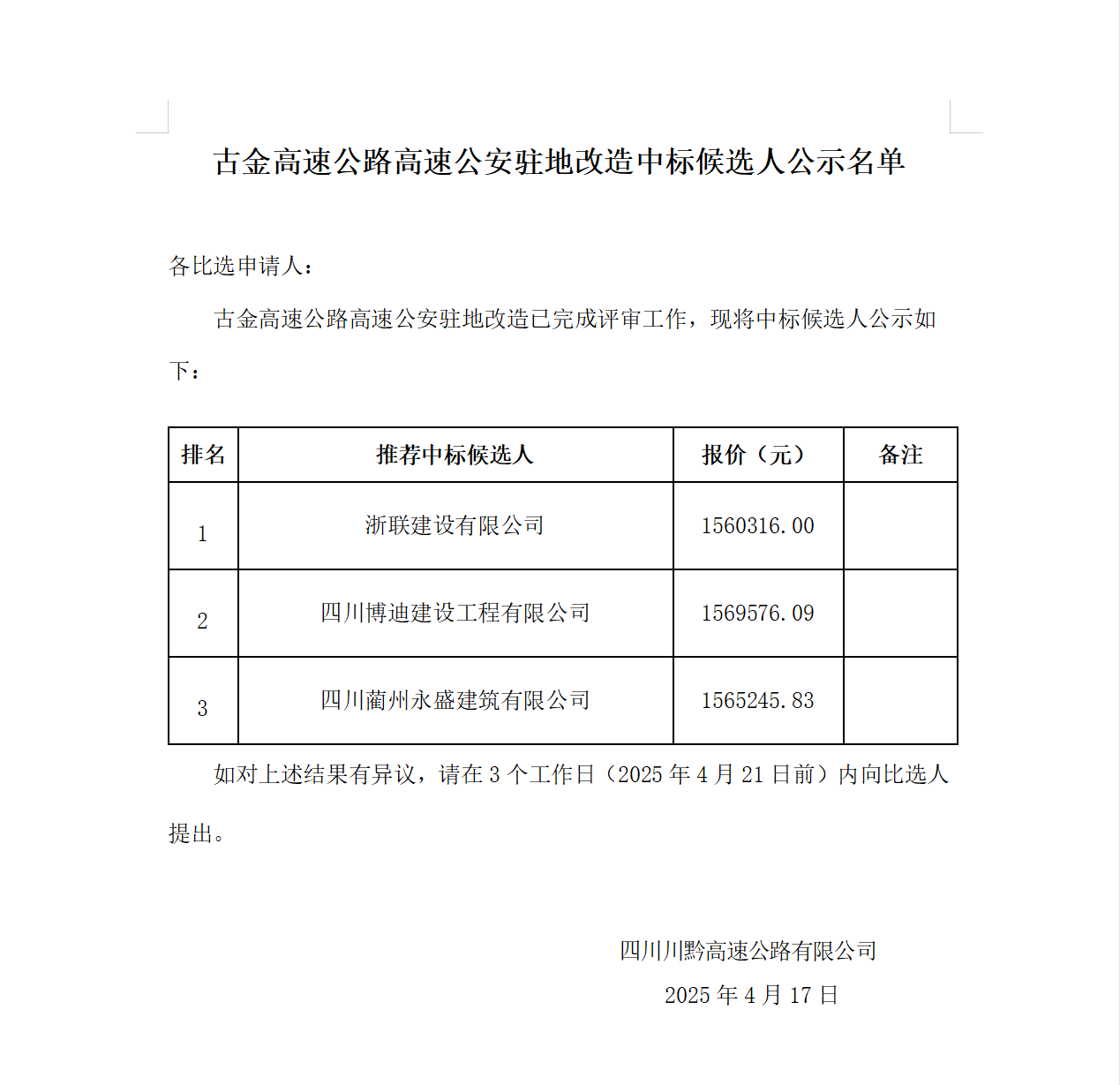 古金高速公路高速公安駐地改造中標(biāo)候選人公示名單