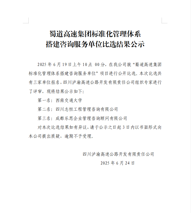 蜀道高速集團標(biāo)準(zhǔn)化管理體系搭建咨詢服務(wù)單位比選結(jié)果公示