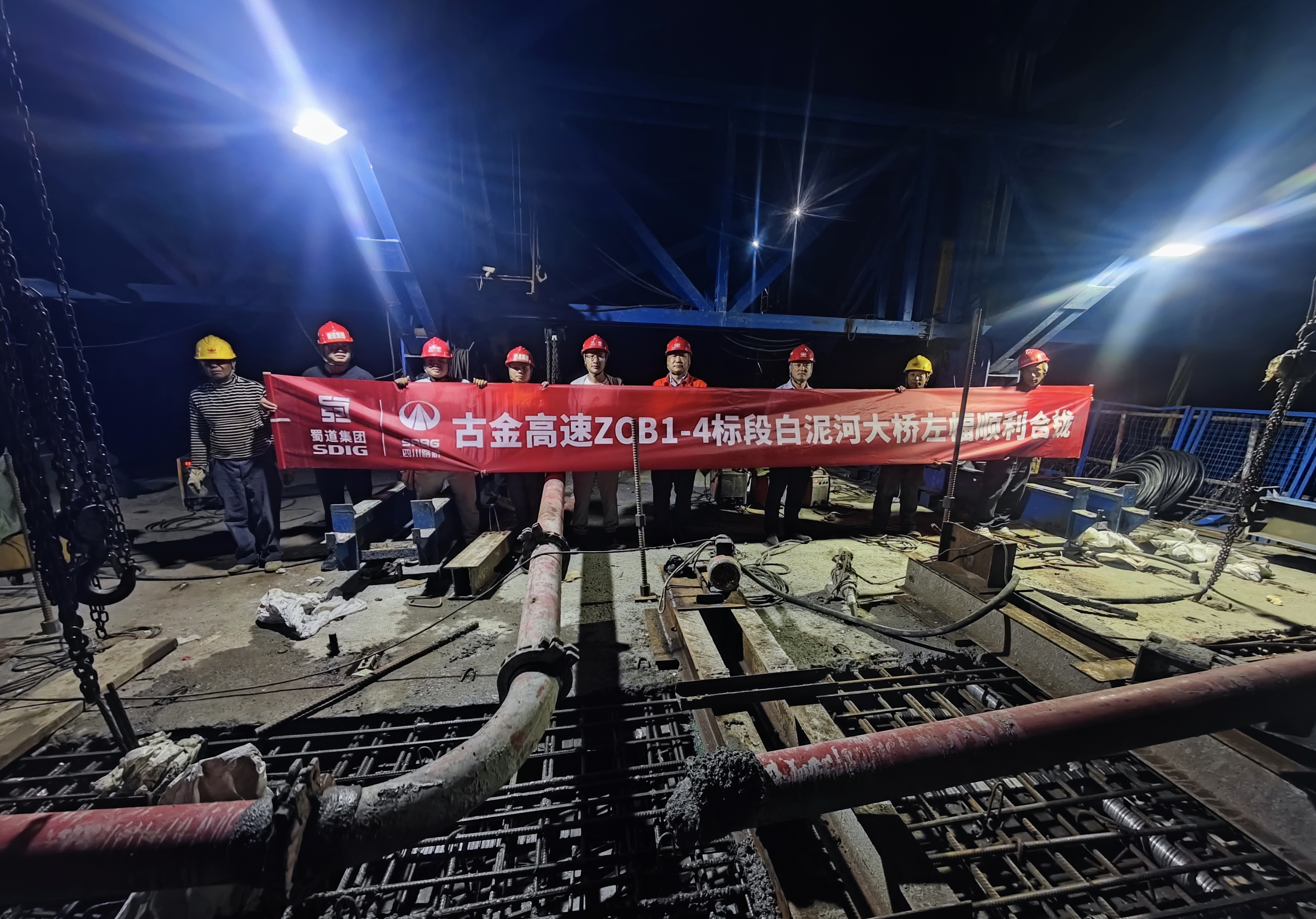 7月15日凌晨,伴隨著白泥河峽谷夜空中星星點(diǎn)點(diǎn)的燈火,古金高速白泥河大橋左線合攏段順利澆筑。